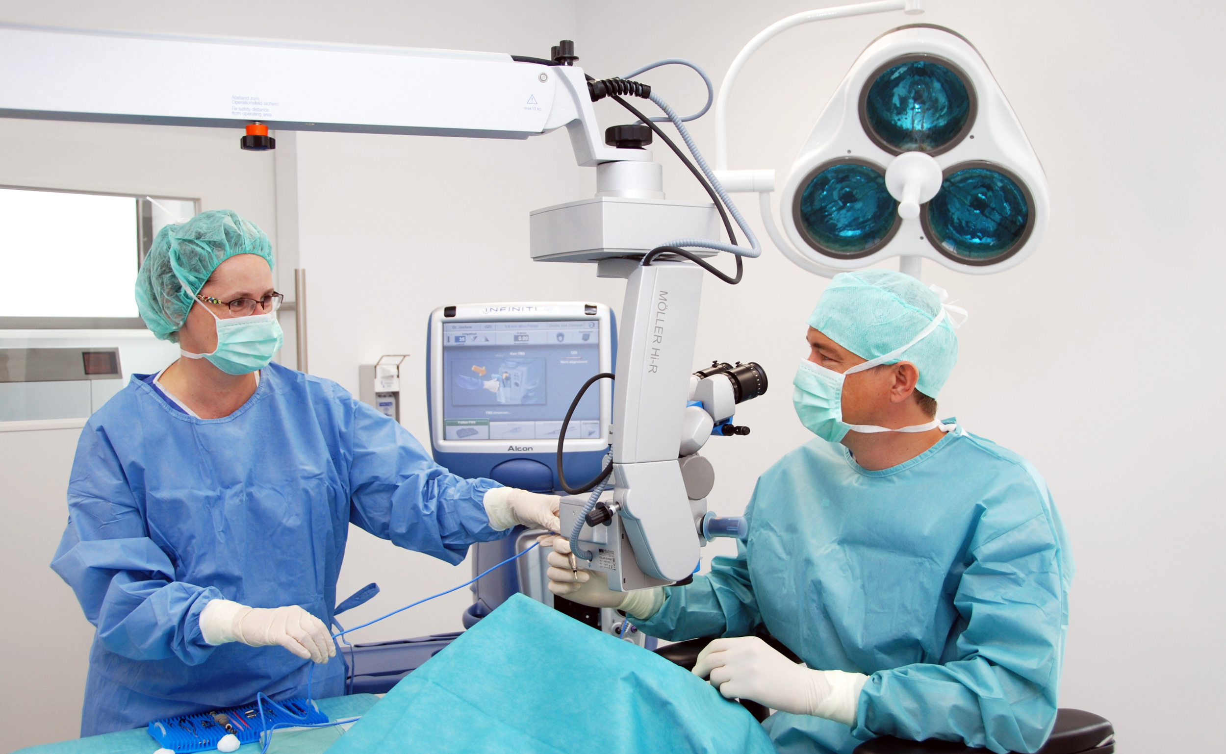 Unsere Operationen erfolgen in modernsten OP-Räumlichkeiten. Der Eingriff wird mittels des modernsten, schnellsten und schonensten Verfahren durchgeführt. Hierbei wird die trübe Linse durch sogenannte Phakoemulsifikation (Ultraschall-zerkleinerung und gleichzeitiges Absaugen der Linse) entfernt.